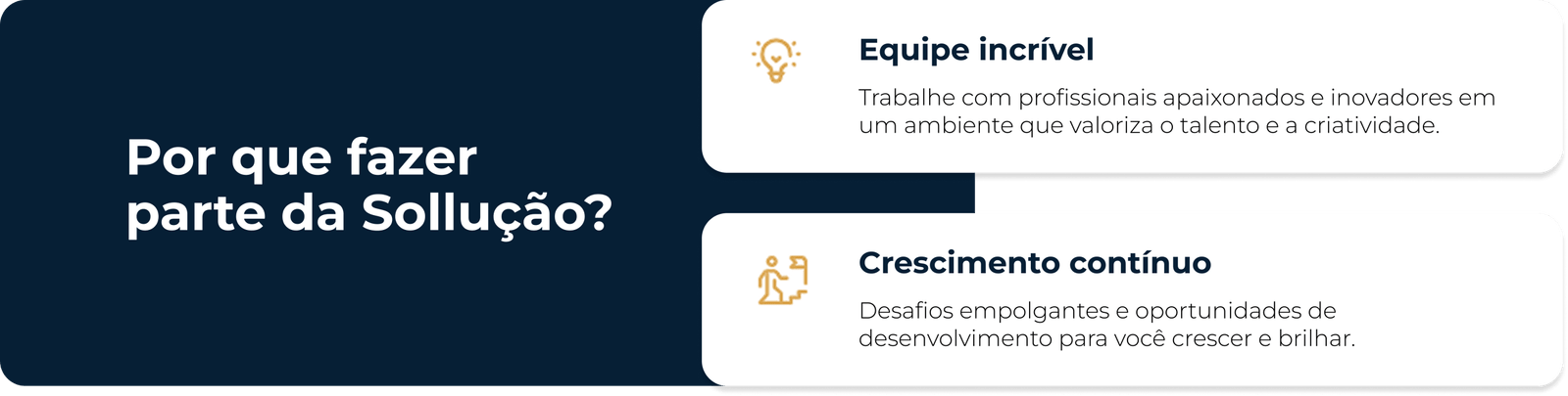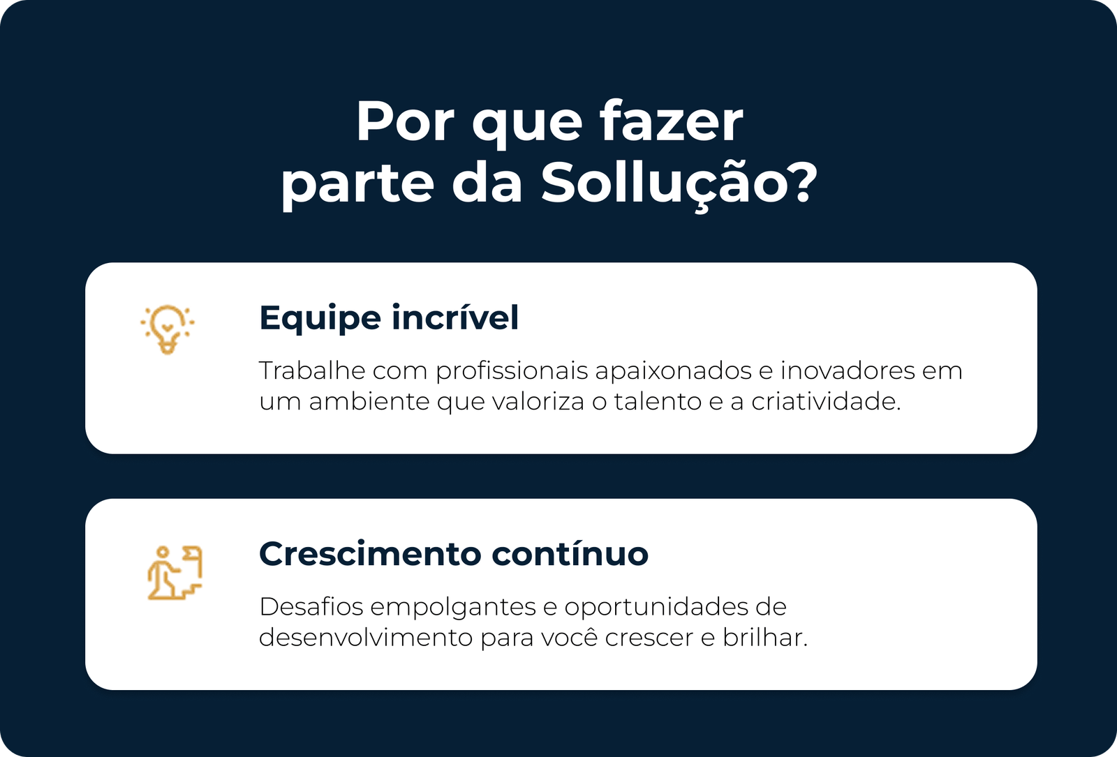 A Sollução é feita de pessoas que entendem o desafio de viver a Reforma Tributária todos os dias. Aqui, cada desafio é uma oportunidade real de criar o extraordinário. Se você é movido por inovação e quer trabalhar ao lado de talentos que lideram a transformação do mercado, o seu lugar é aqui!